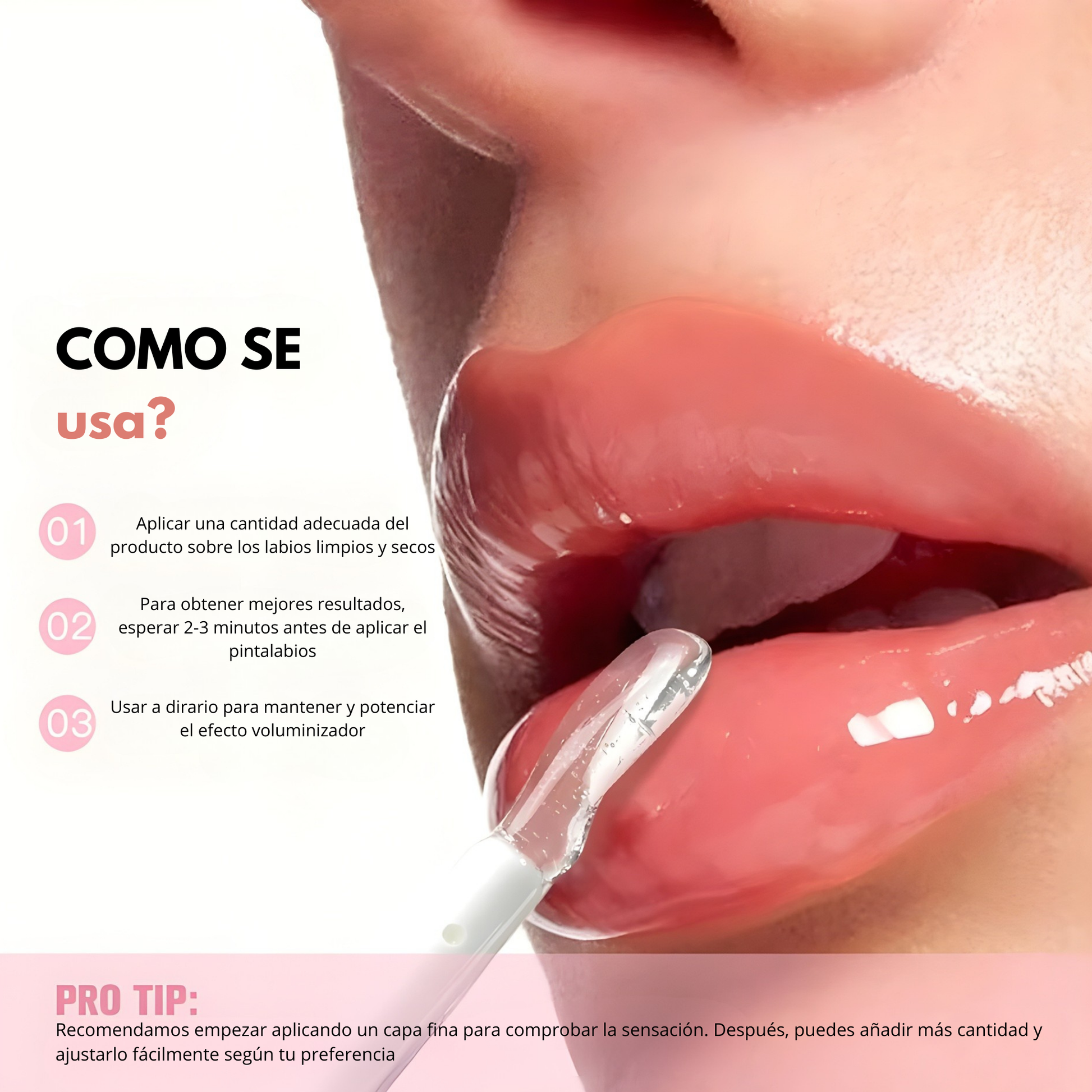 Aplica una pequeña cantidad sobre los labios limpios y secos para comenzar a activar el efecto voluminizador.